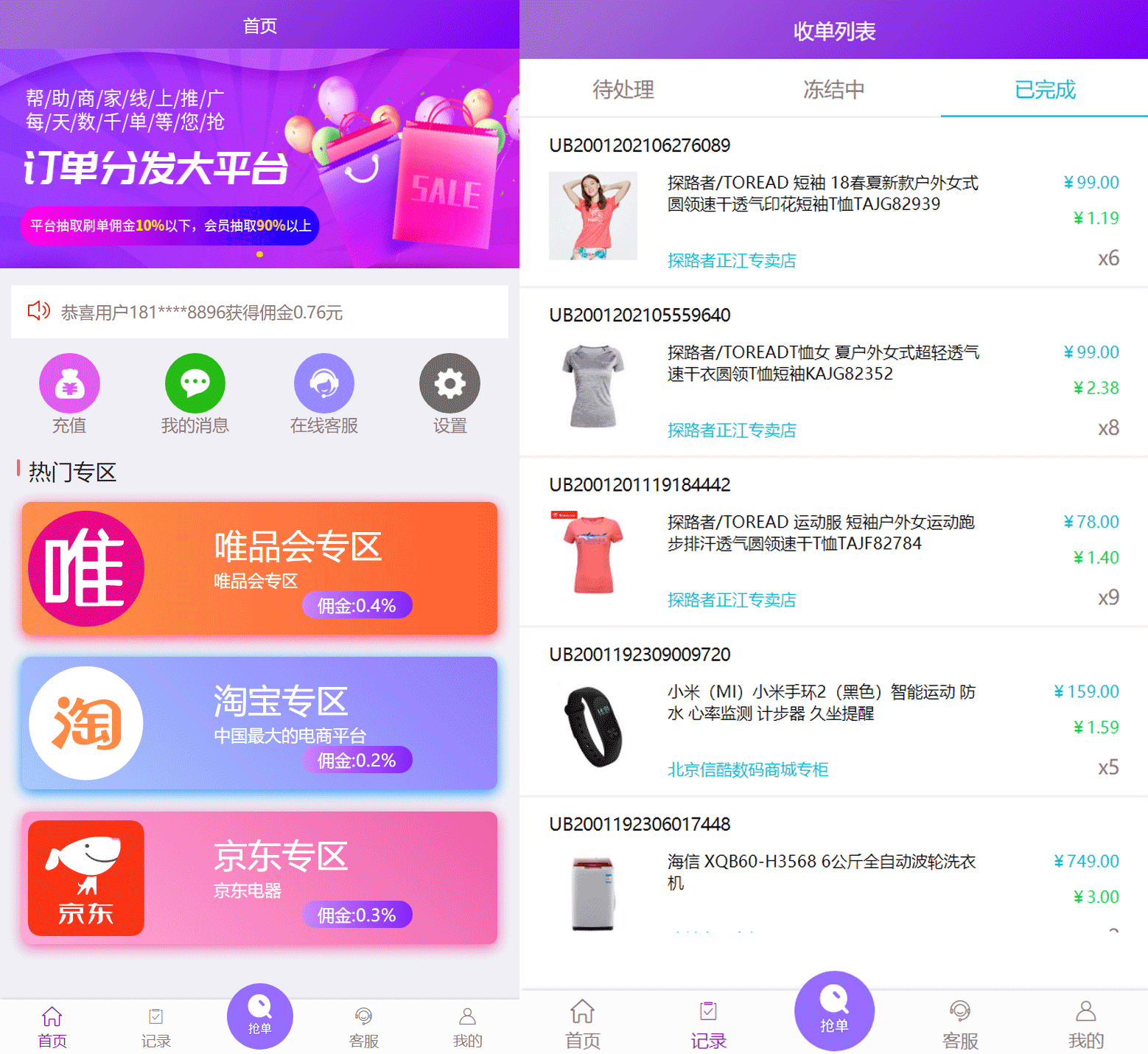 平台与天猫、淘宝、京东、唯品会等网购平台商家合作,通过智能云系统将商家订单匹配给平台用户,