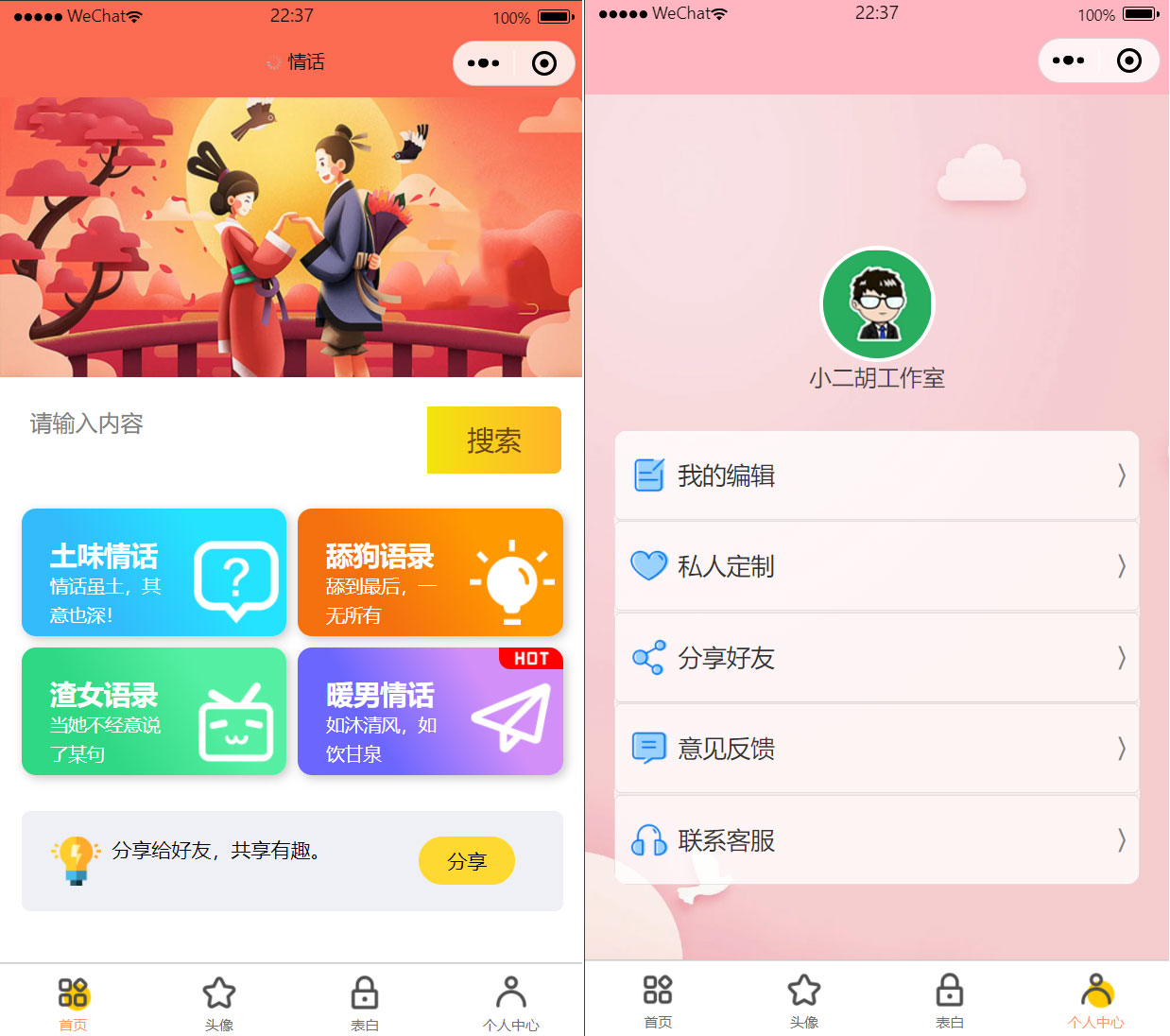 PHP > 恋爱助手情话语录微信QQ双端小程序源码 带流量主