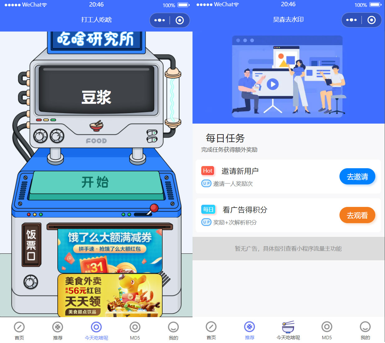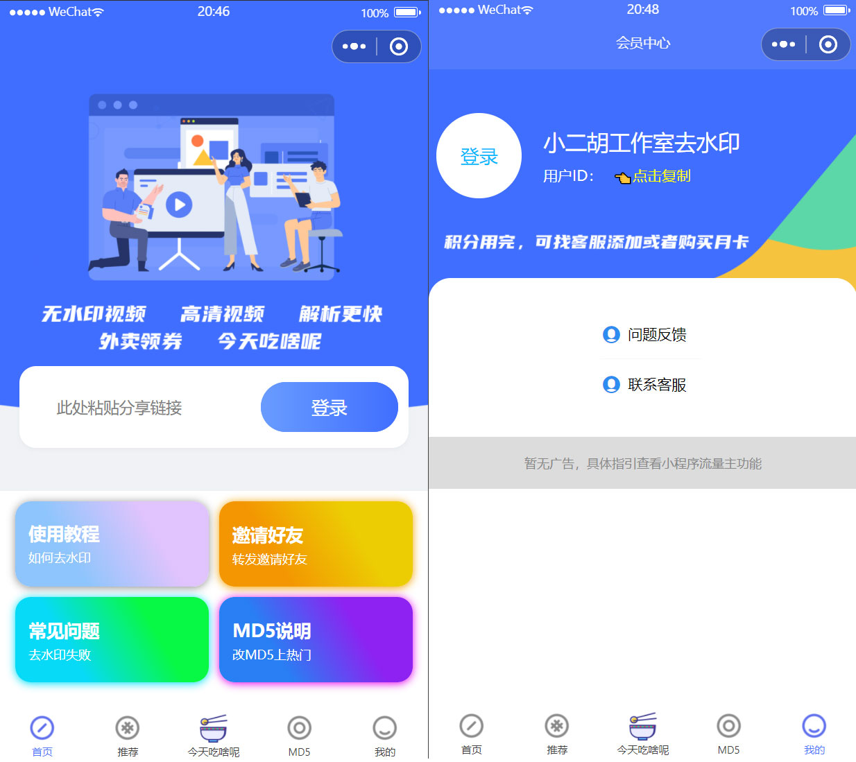蓝色版本视频去水印小程序模板,带有流量主功能,替换流量主广告位即可,没用后台,纯前端模板。仅供参考学习之用,有想法的大佬可以配一套后台~~