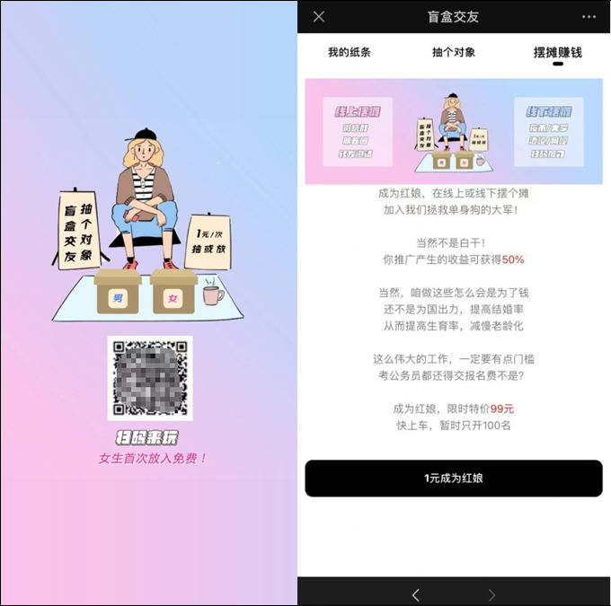 比如各大城市摆地摊的还有各大短视频平台上面流行的一元存联系方式一元取的这种盲盒相亲