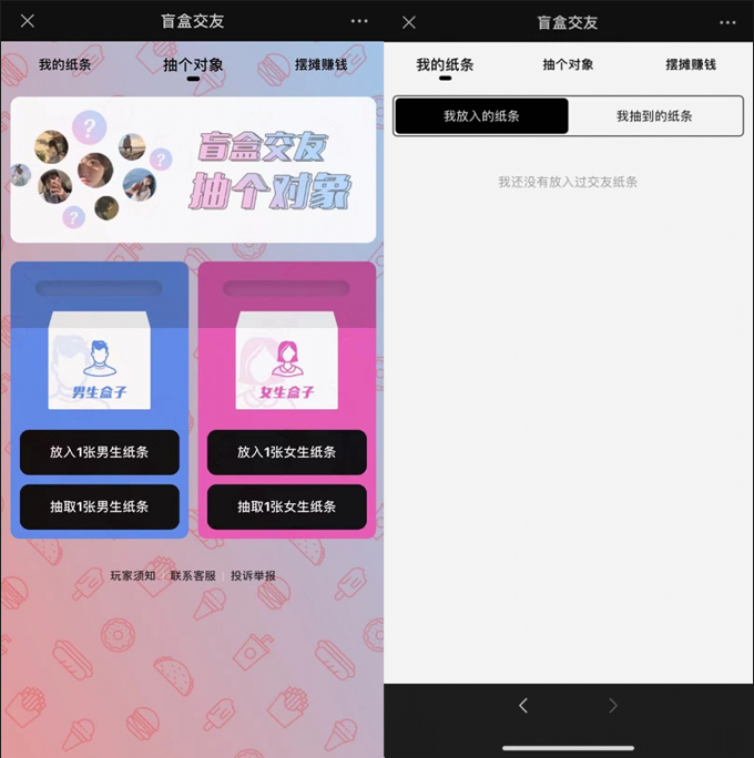 这是一个盲盒交友游戏,你不知道会抽到谁的纸条,也不知道你的纸条将会被谁抽到。